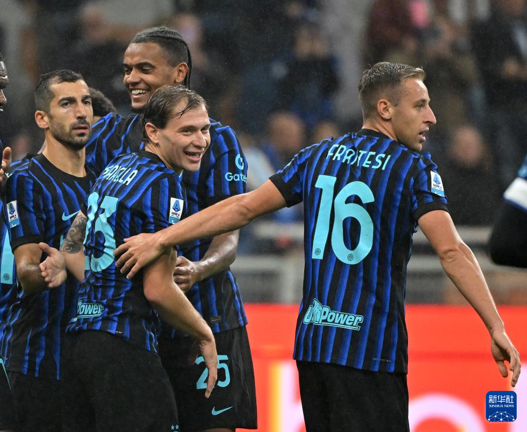 10月4日,国际米兰队球员巴雷拉(左三)与队友庆祝进球。新华社发(阿尔贝托·林格利亚摄)