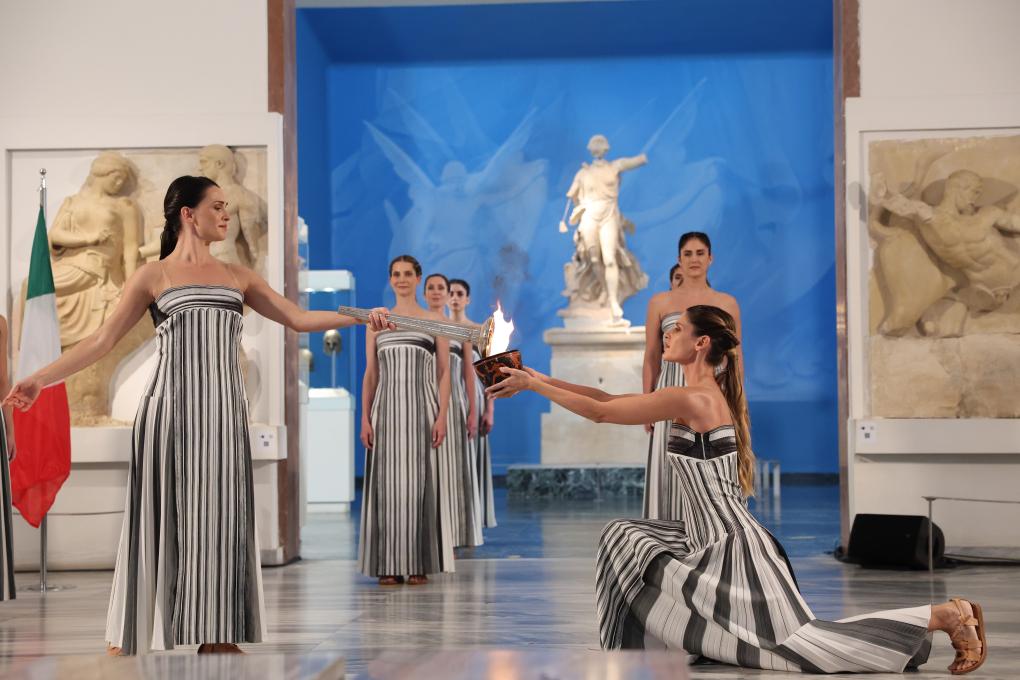 ↑11月26日,第一棒火炬手与扮演最高女祭司的演员玛丽·米娜交接火炬。新华社记者 李京 摄