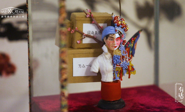 面塑俗稱面人,因?yàn)樗饕念}材都是人物,所以老百姓們也管它叫面人。這個(gè)是“三八婦女節(jié)”那天做的,我看到當(dāng)時(shí)有很多的醫(yī)護(hù)人員作為人類的代表跟另外一個(gè)物種去斗爭、保護(hù)我們,覺得她們還真的是很了不起的。想到以前巾幗英雄里邊穆桂英這個(gè)角色,加上京劇也是我們傳統(tǒng)文化中很寶貴的一個(gè)部分,就把這兩個(gè)結(jié)合在一起做了一個(gè)拼臉。