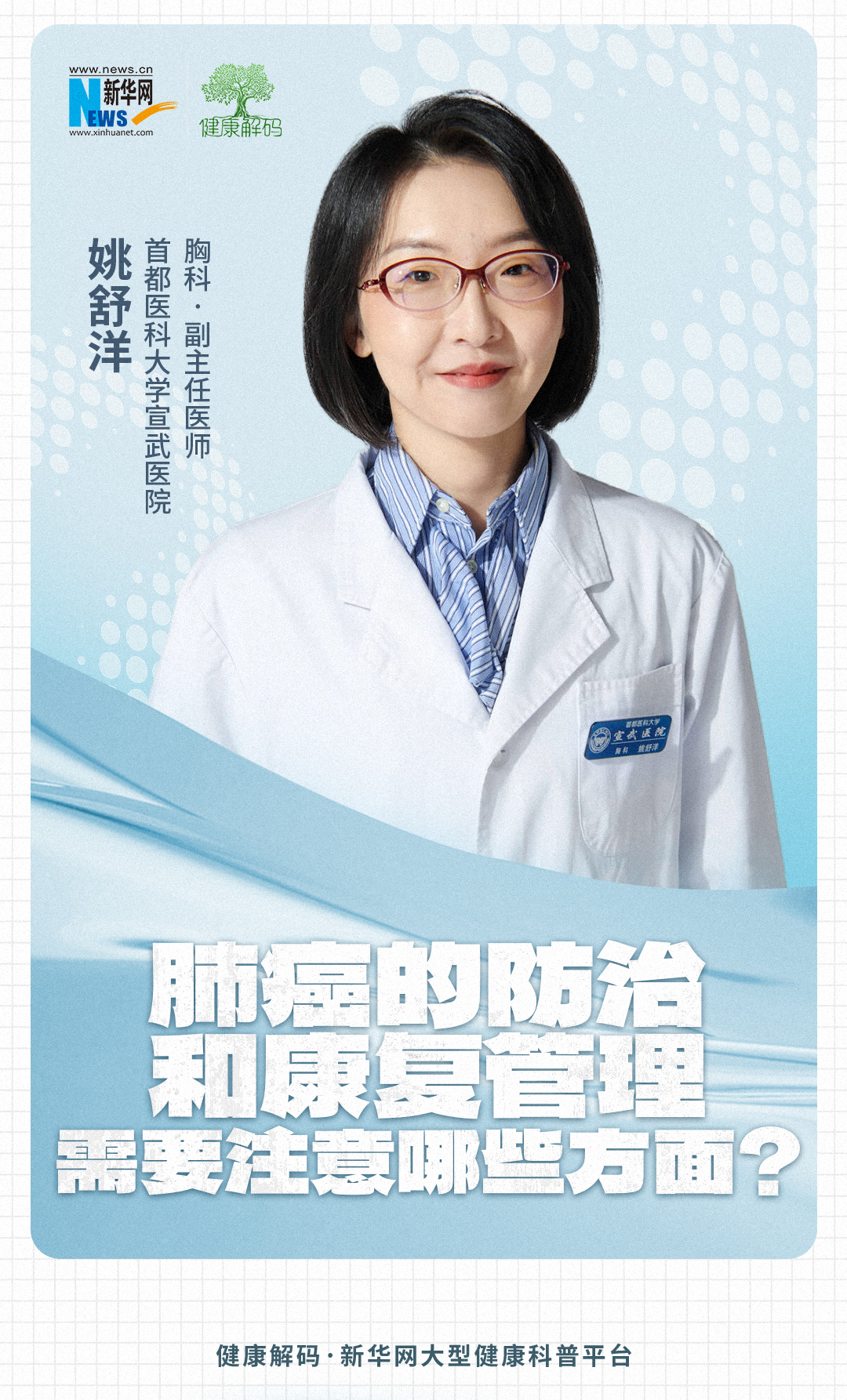 本集节目我们邀请了首都医科大学宣武医院胸科副主任医师姚舒洋分享《肺癌的防治和康复管理需要注意哪些方面》。