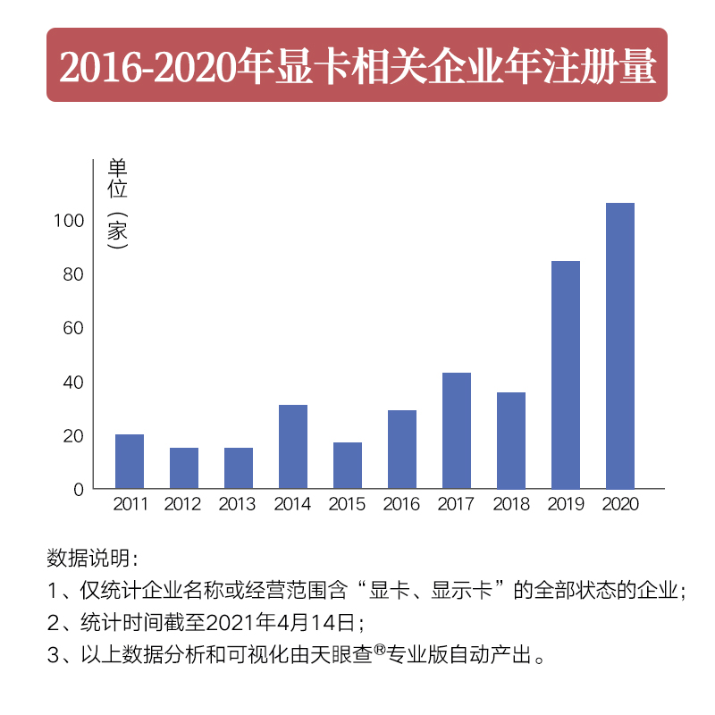 ????? 得益于旺盛的市場需求,以及消費者對顯卡需求的提高,越來越多的企業(yè)投入顯卡生產。我國顯卡相關企業(yè)(全部企業(yè)狀態(tài))新增數量呈現波動上漲趨勢。其中,2019年,新增80余家顯卡相關企業(yè),增速達到17.4%,2020年,新增超過100家,增速高達18.7%,為近十年最高。