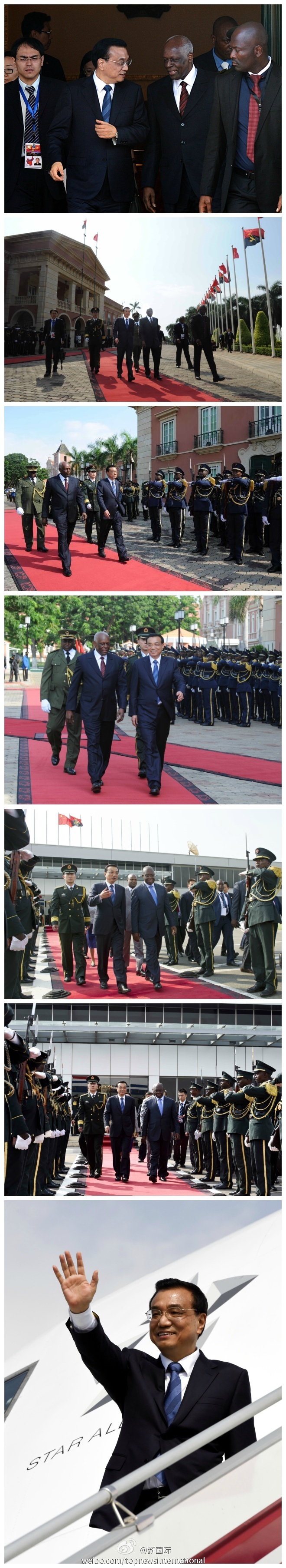 ????新華網(wǎng)北京5月10日電? 據(jù)新華社“新國際”微博報(bào)道,當(dāng)?shù)貢r(shí)間9日下午,李克強(qiáng)總理結(jié)束了在安哥拉的密集訪問行程,安總統(tǒng)多斯桑托斯夫婦在總統(tǒng)府為李克強(qiáng)夫婦舉行歡送儀式,安副總統(tǒng)維森特和外長??频俚綑C(jī)場(chǎng)為李克強(qiáng)夫婦送行。