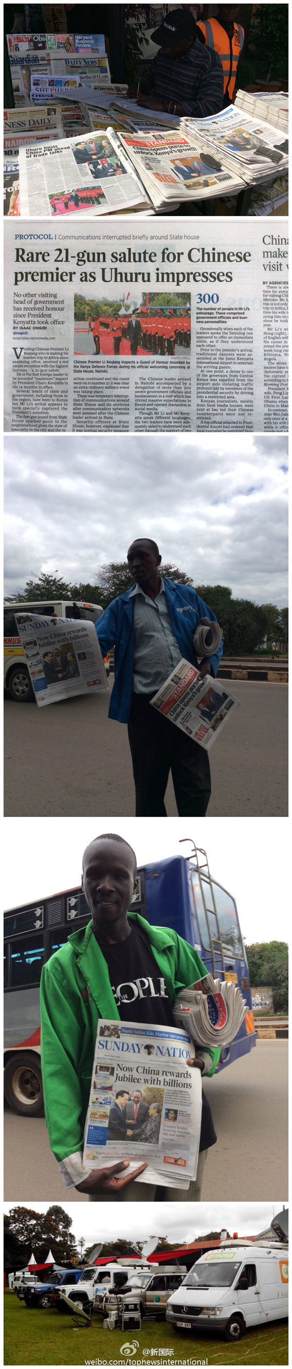 ????新華網北京5月11日電? 據新華社“新國際”微博報道,連日來,肯尼亞各大媒體紛紛對李克強總理訪肯進行全方位報道。主要報紙均在頭版頭條大篇幅介紹訪問情況,并開辟專版引述李總理講話對肯中關系進行述評??先箅娨暸_現(xiàn)場直播李總理和肯雅塔總統(tǒng)會見記者實況??厦襟w還高度評價中國在文化教育等領域的軟實力外交。