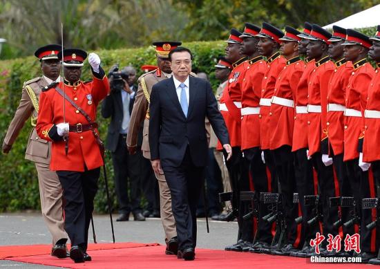 5月10日,中國(guó)國(guó)務(wù)院總理李克強(qiáng)在肯尼亞總統(tǒng)府廣場(chǎng)出席肯總統(tǒng)肯雅塔舉行的歡迎儀式。中新社發(fā) 劉震 攝