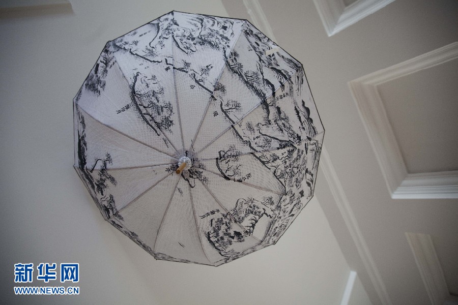 圖為10日所拍攝的“融?工藝設計生活”設計展上的一把糊傘。