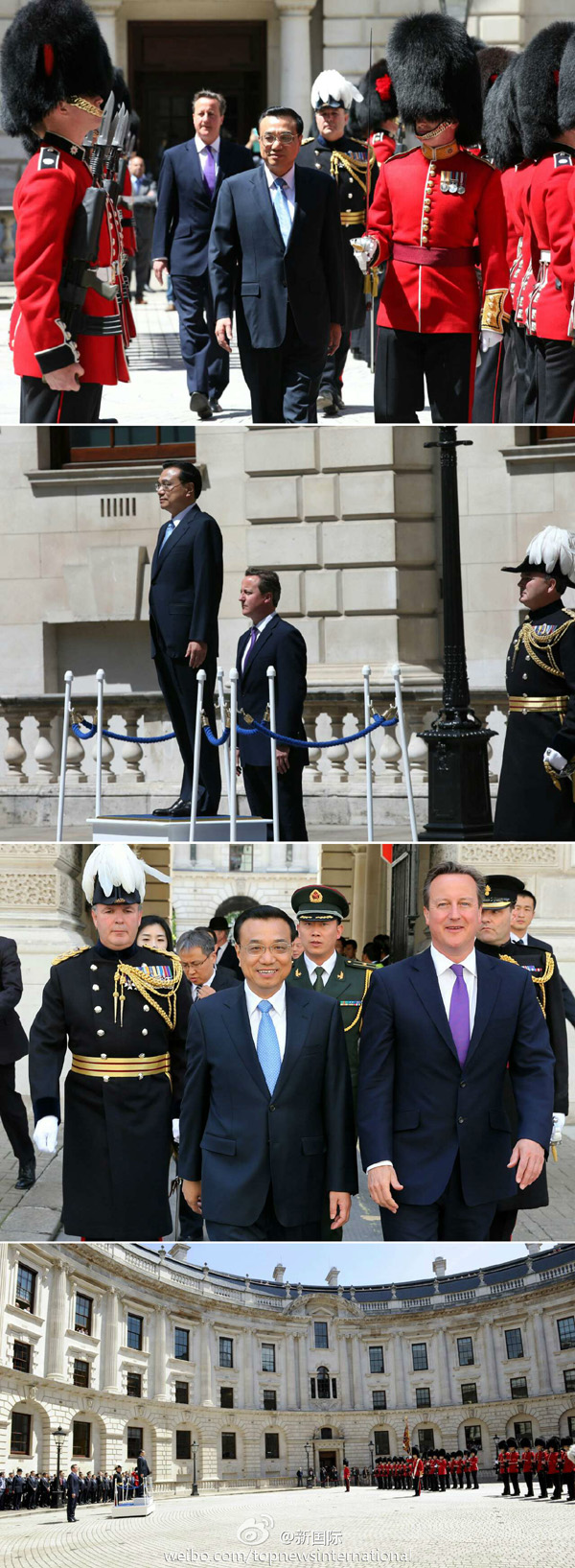 新華網(wǎng)北京6月17日電 據(jù)新華社“新國際”微博報道,當(dāng)?shù)貢r間17日中午,英國首相卡梅倫在英國財政部庭院內(nèi)為李克強(qiáng)總理舉行隆重的歡迎儀式。軍樂隊奏中英兩國國歌。李克強(qiáng)在卡梅倫的陪同下檢閱了儀仗隊。