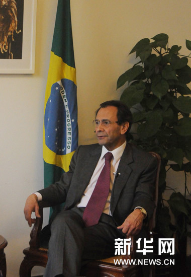 ??? 圖為巴西駐華大使瓦爾德馬爾·卡爾內(nèi)魯·萊昂(右)接受新華網(wǎng)專訪。新華網(wǎng)記者 劉小軍攝