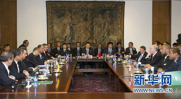 ??? 當(dāng)?shù)貢r(shí)間7月17日,國家主席習(xí)近平在巴西利亞會(huì)見拉美和加勒比國家共同體輪值主席國哥斯達(dá)黎加總統(tǒng)索利斯、前任輪值主席國古巴國務(wù)委員會(huì)主席兼部長會(huì)議主席勞爾·卡斯特羅、候任輪值主席國厄瓜多爾總統(tǒng)科雷亞、加勒比共同體輪值主席國安提瓜和巴布達(dá)總理布朗。新華社記者 謝環(huán)馳 攝