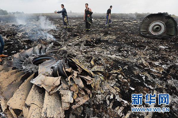 ????在烏克蘭境內(nèi)墜毀的馬航MH17客機(jī)殘骸。這是7月17日在靠近俄羅斯邊界的烏克蘭東部地區(qū)拍攝的客機(jī)墜毀現(xiàn)場。新華社發(fā)