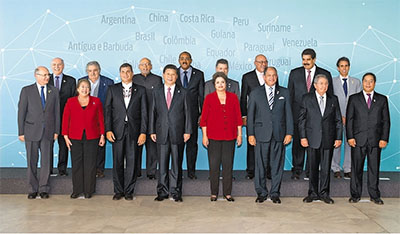 ? 當?shù)貢r間7月17日下午,中國—拉美和加勒比國家領導人會晤在巴西利亞舉行。本次會晤由中方倡議,中國國家主席習近平、巴西總統(tǒng)羅塞夫、哥斯達黎加總統(tǒng)索利斯、古巴國務委員會主席兼部長會議主席勞爾·卡斯特羅、厄瓜多爾總統(tǒng)科雷亞、蘇里南總統(tǒng)鮑特塞、哥倫比亞總統(tǒng)桑托斯、智利總統(tǒng)巴切萊特、圭亞那總統(tǒng)拉莫塔爾、烏拉圭總統(tǒng)穆???、委內瑞拉總統(tǒng)馬杜羅、安提瓜和巴布達總理布朗等出席。
