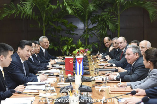 ??? 新華網(wǎng)北京7月23日電 據(jù)新華社“新國際”微博報(bào)道,習(xí)近平22日同古巴國務(wù)委員會(huì)主席兼部長會(huì)議主席勞爾·卡斯特羅會(huì)談時(shí),對(duì)發(fā)展中古關(guān)系提出3個(gè)“堅(jiān)定不移”:堅(jiān)定不移深化肝膽相照的友誼,堅(jiān)定不移開展互利共贏的合作,堅(jiān)定不移做改革發(fā)展的伙伴。(李學(xué)仁攝)