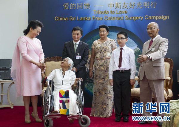 ????在兩國元首夫人共同見證下,許鵬飛為一位接受復(fù)明手術(shù)的斯里蘭卡白內(nèi)障患者揭開紗布。彭麗媛和施蘭蒂向在場的斯里蘭卡復(fù)明患者致以問候和祝福。彭麗媛向斯方贈送白內(nèi)障手術(shù)儀器,鼓勵“中斯友好光明行”活動繼續(xù)譜寫中斯友好交往的佳話。
