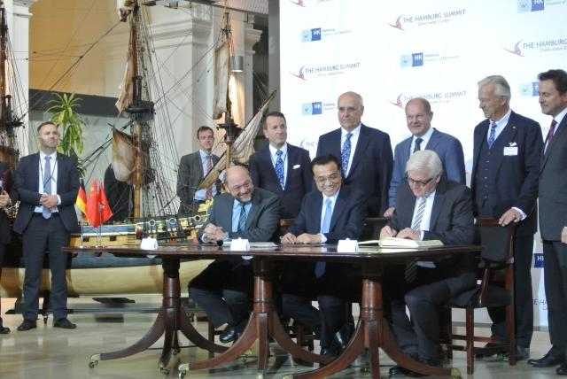 在中歐論壇漢堡峰會第六屆會議的舉行地漢堡商會的簽字大廳里,放著一艘帆船模型。天花板上也懸掛了很多船只模型。