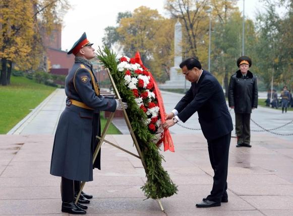 ????新華網(wǎng)北京10月14日電 據(jù)新華社“新華國(guó)際”客戶端報(bào)道,一場(chǎng)秋雨洗滌了莫斯科的寒夜。13日一早,克強(qiáng)總理來(lái)到克里姆林宮外的無(wú)名烈士墓,憑吊衛(wèi)國(guó)戰(zhàn)爭(zhēng)中的犧牲者。