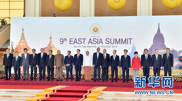 ????11月13日,中國(guó)國(guó)務(wù)院總理李克強(qiáng)在內(nèi)比都出席第九屆東亞峰會(huì)并發(fā)言。這是峰會(huì)開(kāi)始前,與會(huì)領(lǐng)導(dǎo)人合影。 新華社記者 李濤 攝
