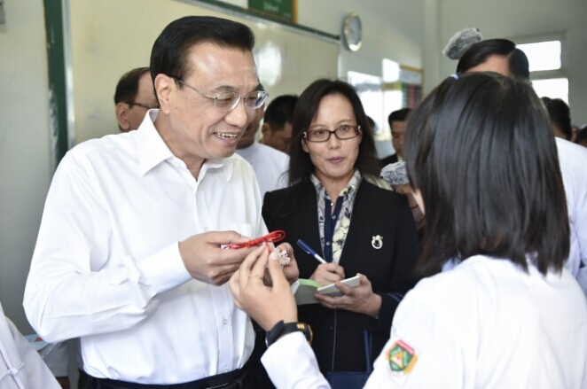 11月14日,克強(qiáng)總理來到內(nèi)比都第十四中學(xué)與青少年們交流。