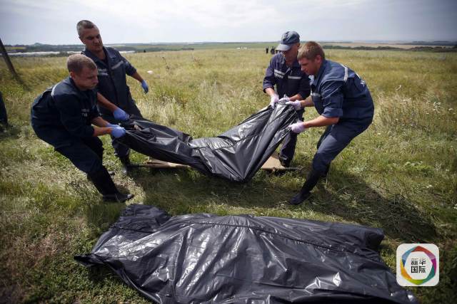 2014年7月19日,在烏克蘭頓涅茨克州的MH17航班墜機(jī)現(xiàn)場,烏克蘭緊急情況部工作人員搬運遇難者遺體。新華社/路透