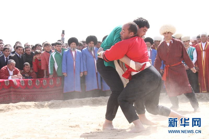 3月21日,在土庫曼斯坦首都阿什哈巴德,現(xiàn)場進行摔跤比賽。新華社記者盧敬利 攝