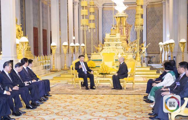 習(xí)近平在金邊會(huì)見柬埔寨國(guó)王西哈莫尼。(新華社記者謝環(huán)馳攝)
