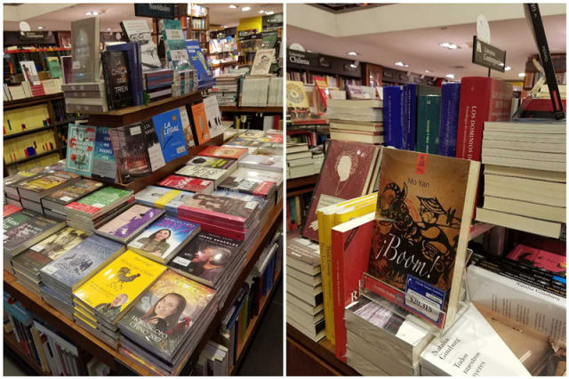 圖為中國著名作家莫言的小說《爆炸》西文版在圣地亞哥一家書店銷售。(新華社記者劉華攝)