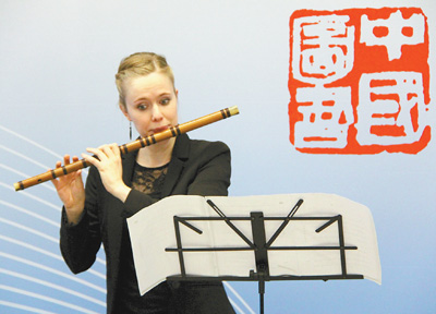1月11日,在瑞士蘇黎世大學,一名當?shù)貙W生在“中國圖書中心”揭幕儀式上表演笛子獨奏。