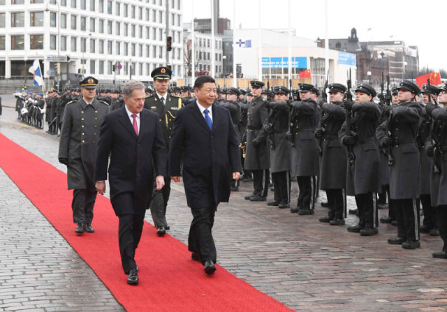 4月5日,國家主席習(xí)近平在赫爾辛基同芬蘭總統(tǒng)尼尼斯托舉行會談。會談前,習(xí)近平出席尼尼斯托在總統(tǒng)府庭院舉行的隆重歡迎儀式。(新華社記者饒愛民攝)