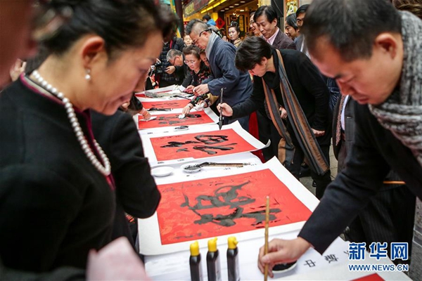 2月11日,在日本橫濱,書法家在活動(dòng)現(xiàn)場寫“福”字。新華社記者馬曹冉攝