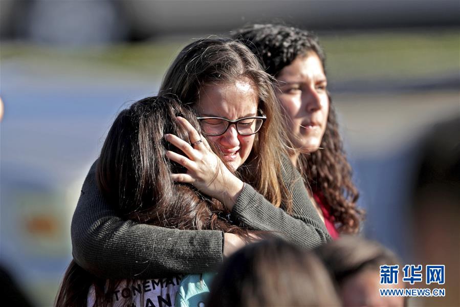 2月14日,在美國佛羅里達(dá)州帕克蘭市發(fā)生槍擊的高中,安全撤離的學(xué)生相擁而泣。美國佛羅里達(dá)州布勞沃德縣警方14日說,當(dāng)?shù)匾桓咧邪l(fā)生的槍擊案已造成17人死亡。 新華社/美聯(lián)