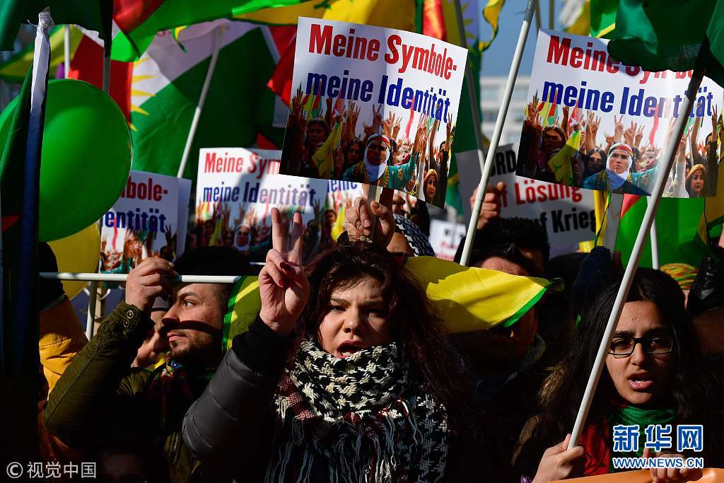 當(dāng)?shù)貢r(shí)間2018年3月3日,德國(guó)柏林,當(dāng)?shù)孛癖娕e行游行,抗議土耳其對(duì)敘利亞阿夫林地區(qū)的庫(kù)爾德人采取軍事行動(dòng)。(圖片來(lái)源:視覺中國(guó))