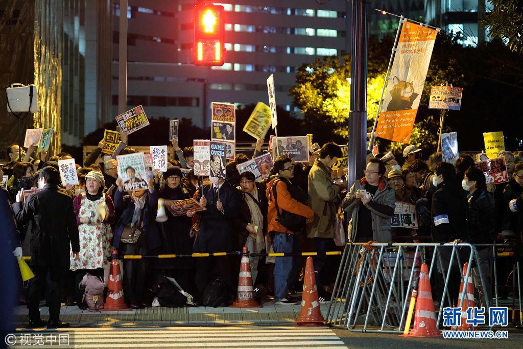 3月12日,日本東京,日本民眾在首相府邸前游行抗議。安倍晉三此前就森友學(xué)園丑聞事件的文件被篡改一事道歉。(圖片來(lái)源:視覺中國(guó))