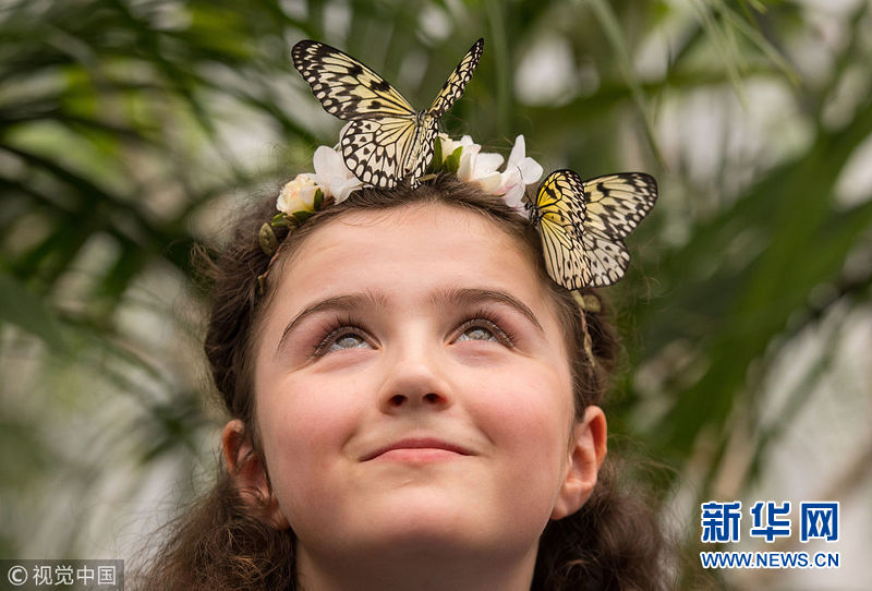 3月28日,英國倫敦自然歷史博物館舉辦奇異蝴蝶展,各式美麗新奇的蝴蝶翩翩飛舞,吸引了前來參觀的兒童與之親密接觸。(圖片來源:視覺中國)