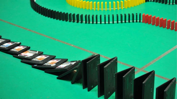 此次的多米諾挑戰(zhàn)除了520臺筆記本外,還準(zhǔn)備了45000枚骨牌?;顒又黝}以及工程師們標(biāo)志性的代碼都成為了多米諾骨牌整體設(shè)計(jì)的一部分。最終,所有多米諾骨牌和筆記本電腦全部被成功推倒。