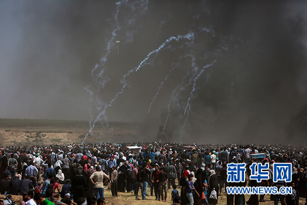 5月14日,在加沙城以東的加沙地帶與以色列交界地區(qū),巴勒斯坦示威者與以色列軍隊(duì)發(fā)生沖突。新華社發(fā)