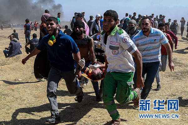 5月14日,在加沙城以東的加沙地帶與以色列交界地區(qū),人們轉(zhuǎn)移一名在沖突中受傷的巴勒斯坦示威者。新華社發(fā)