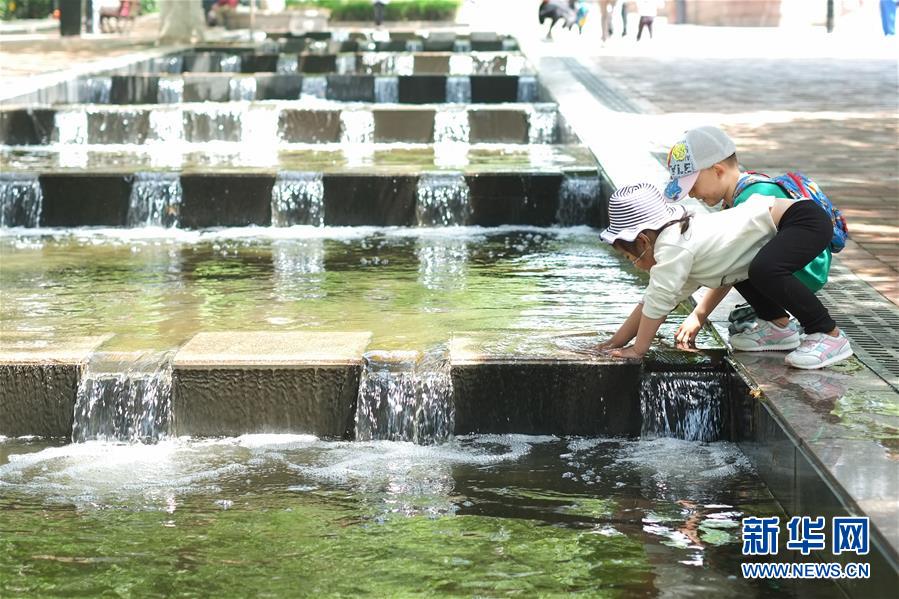 5月23日,小朋友在青島老舍公園戲水玩耍。新華社記者張鋮攝