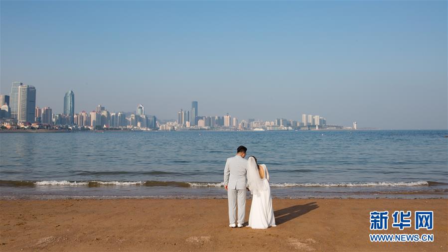 一對新人在青島第三海水浴場拍攝婚紗照(5月4日攝)。新華社記者張鋮攝