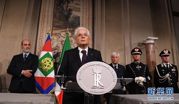 5月27日,在意大利首都羅馬,意總統(tǒng)馬塔雷拉發(fā)表講話(huà)。據(jù)當(dāng)?shù)孛襟w報(bào)道,意大利新任總理孔特27日晚間與總統(tǒng)馬塔雷拉會(huì)面并提交擬定的內(nèi)閣成員名單時(shí),馬塔雷拉否決了由意大利聯(lián)盟黨和五星運(yùn)動(dòng)力推的持疑歐立場(chǎng)的經(jīng)濟(jì)學(xué)家保羅·薩沃納出任財(cái)政部長(zhǎng)??滋叵蚩偨y(tǒng)提出放棄組閣任務(wù)請(qǐng)求,請(qǐng)求得到總統(tǒng)確認(rèn)。新華社發(fā)(阿爾貝托·林格里亞攝)