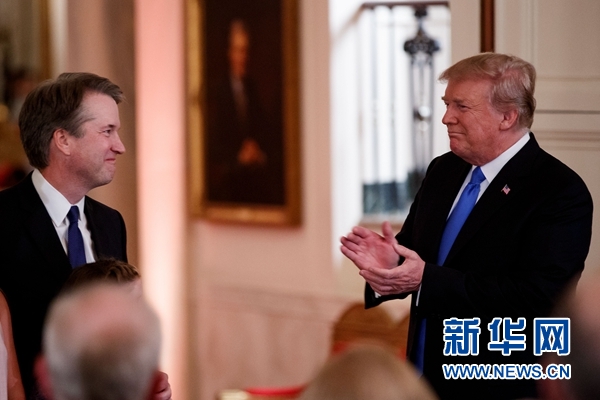 特朗普當(dāng)日晚間在白宮講話時(shí)宣布了這一決定,卡瓦諾同家人一起出席了提名典禮。