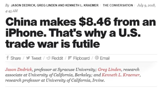 他們給出的理由則既簡(jiǎn)單又引人矚目:“因?yàn)橹袊?guó)每出口一個(gè)iPhone給美國(guó),只收入8.46美元”。