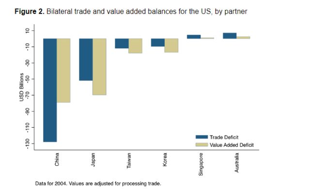 更引人注目的是,如此計(jì)算的話,那么比如2004年時(shí)日本和美國(guó)的貿(mào)易逆差就會(huì)暴增33%,直接逼近當(dāng)時(shí)中美按這種算法得出的貿(mào)易逆差了——畢竟,在不少中國(guó)出口給美國(guó)的產(chǎn)品中,擁有專(zhuān)利技術(shù)的日本的“附加價(jià)值”是很高的。