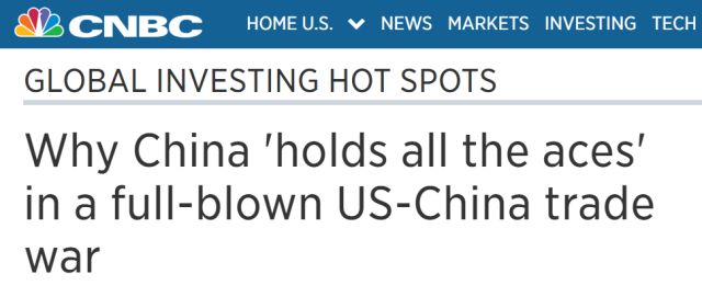 因此,CNBC這篇文章的作者也得出了與“布魯金斯學(xué)會(huì)”一樣的結(jié)論,即特朗普現(xiàn)在對(duì)中國(guó)的打擊只會(huì)傷及自身和盟友。這位作者甚至也列舉了CBS新聞網(wǎng)今天提到的那個(gè)iPhone手機(jī)的例子,并認(rèn)為一旦中美貿(mào)易戰(zhàn)“全面爆發(fā)”,中國(guó)手上可打的“王牌”要比美國(guó)多。