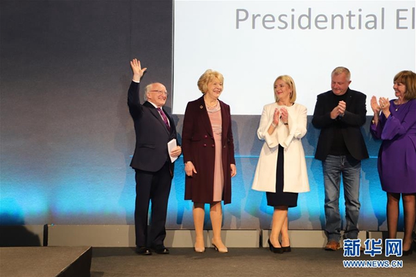10月27日,在愛爾蘭首都都柏林,希金斯(左一)在總統(tǒng)選舉獲勝后向支持者致意。愛爾蘭總統(tǒng)選舉機構(gòu)負(fù)責(zé)人27日晚宣布,愛爾蘭現(xiàn)任總統(tǒng)希金斯在26日舉行的選舉中獲勝,再次當(dāng)選總統(tǒng)。新華社發(fā)