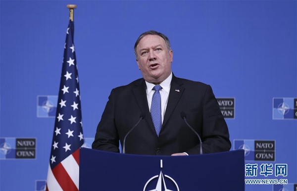 12月4日,在比利時布魯塞爾,美國國務(wù)卿蓬佩奧出席新聞發(fā)布會。 新華社記者 葉平凡 攝