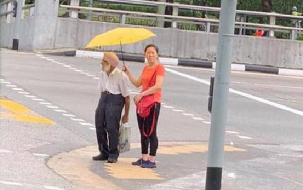 12月8日,新加坡的一個(gè)交通路口,傾盆大雨中,一名中國女性為一名印度錫克教徒打扮的老者撐傘。