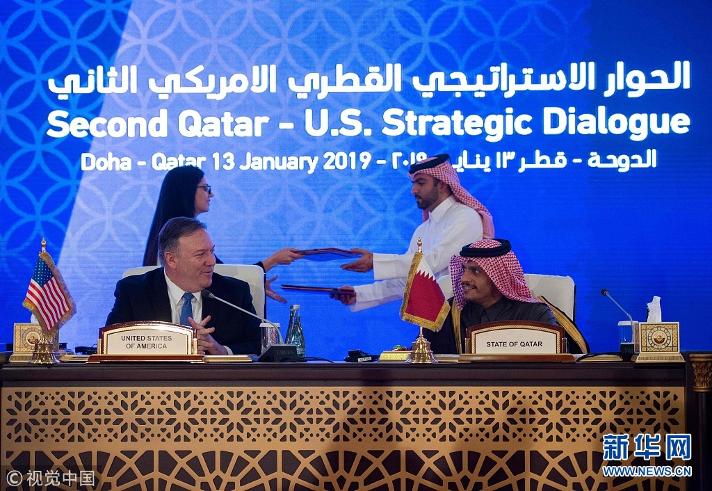 2019年1月13日,卡塔爾多哈,美國國務(wù)卿邁克·蓬佩奧訪問卡塔爾。蓬佩奧與卡塔爾副首相兼外交大臣穆罕默德在多哈的喜來登大酒店簽署了諒解備忘錄和意向聲明并舉行聯(lián)合記者會。蓬佩奧表示,兩國外交部門領(lǐng)導(dǎo)人當天簽署了一份諒解備忘錄,將擴建和改造烏代德美國空軍基地。(圖片來源:視覺中國)