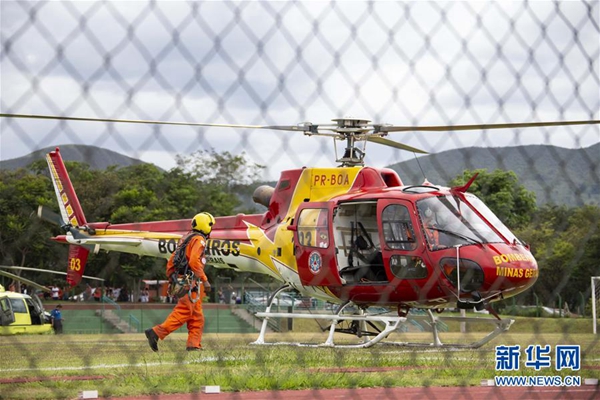1月26日,在巴西米納斯吉拉斯州布魯馬迪紐市附近的一處救助點(diǎn),一名消防員在執(zhí)行援救工作的直升機(jī)前。新華社記者 李明 攝