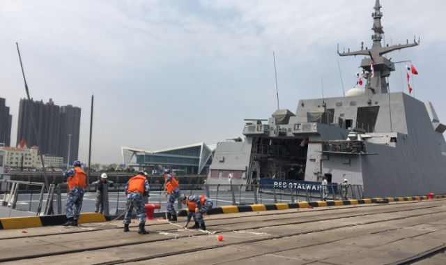 19日10時許,新加坡海軍“堅強”號護(hù)衛(wèi)艦緩緩駛?cè)肭鄭u大港碼頭。這是參加中國人民解放軍海軍成立70周年多國海軍活動到訪的第一艘外國海軍艦艇。新華社記者梅世雄 攝