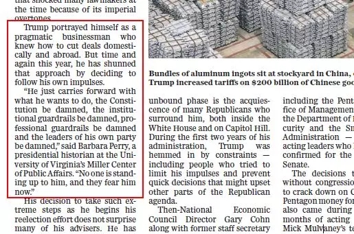“他把自己描繪成一個務實的商人”,但是“他只是想做什么就做什么,憲法該死、制度該死、專業(yè)防護措施該死,”弗吉尼亞大學米勒公共事務中心的總統歷史學家芭芭拉·佩里說:“他所在黨派的領導人都很可惡,”“沒有人站起來對抗他,他們現在害怕他。”