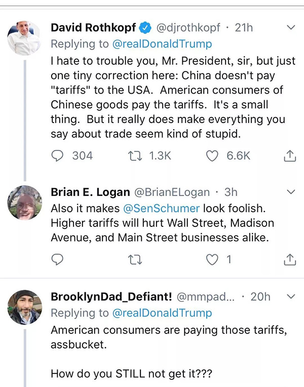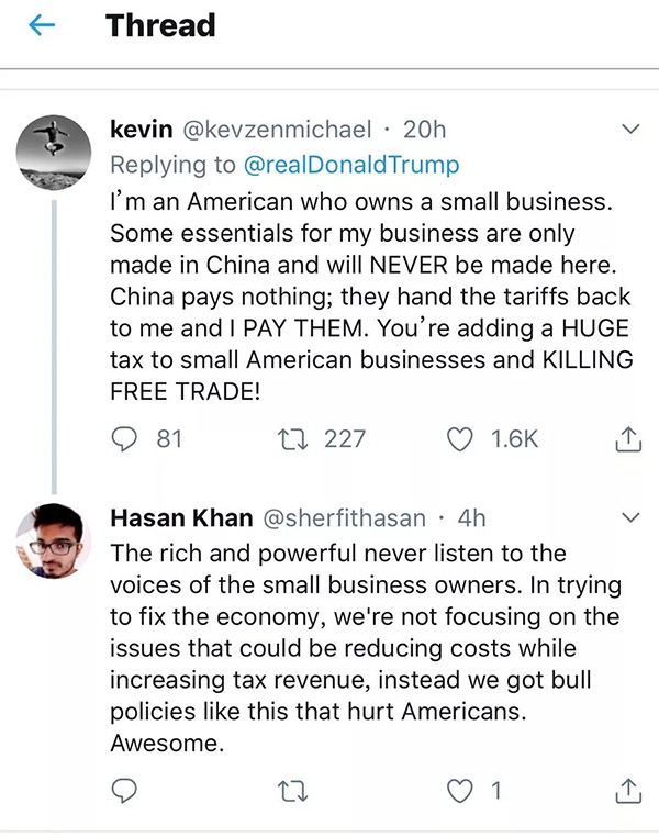 “我是一個(gè)擁有一家小企業(yè)的美國人。對我的生意來說,有些關(guān)鍵商品必須由中國制造而且永遠(yuǎn)也不可能在美國生產(chǎn)出來。中國什么也沒付,是我付出了那些關(guān)稅!你給美國的企業(yè)們加上了巨大的稅賦!你正在扼殺自由貿(mào)易!”