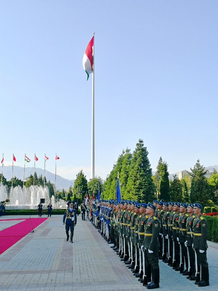 儀仗隊(duì)在塔吉克斯坦總統(tǒng)府列隊(duì),等候兩國元首檢閱。遠(yuǎn)處高聳的旗桿位于總統(tǒng)府外的國旗公園,高165米,是杜尚別的地標(biāo)建筑之一。新華社記者 霍小光 攝